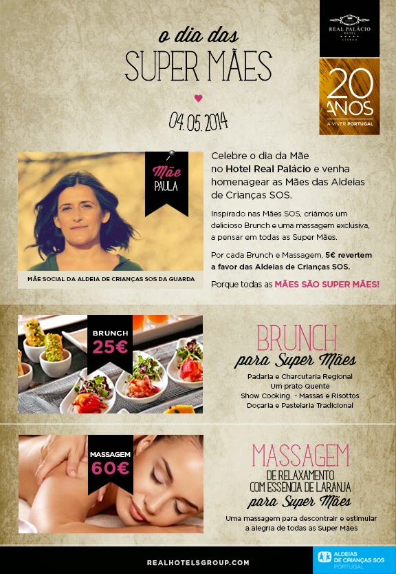 No dia 4 de Maio, para além de comemorar o dia da Mãe nos Hotéis Real é feita uma  homenagem às Mães da Aldeias de Crianças SOS. Eu apoio o brunch inspirado na Mãe Paula, no Hotel Real Palácio, custa 25€ e 5€ revertem para as Aldeias de Crianças SOS.