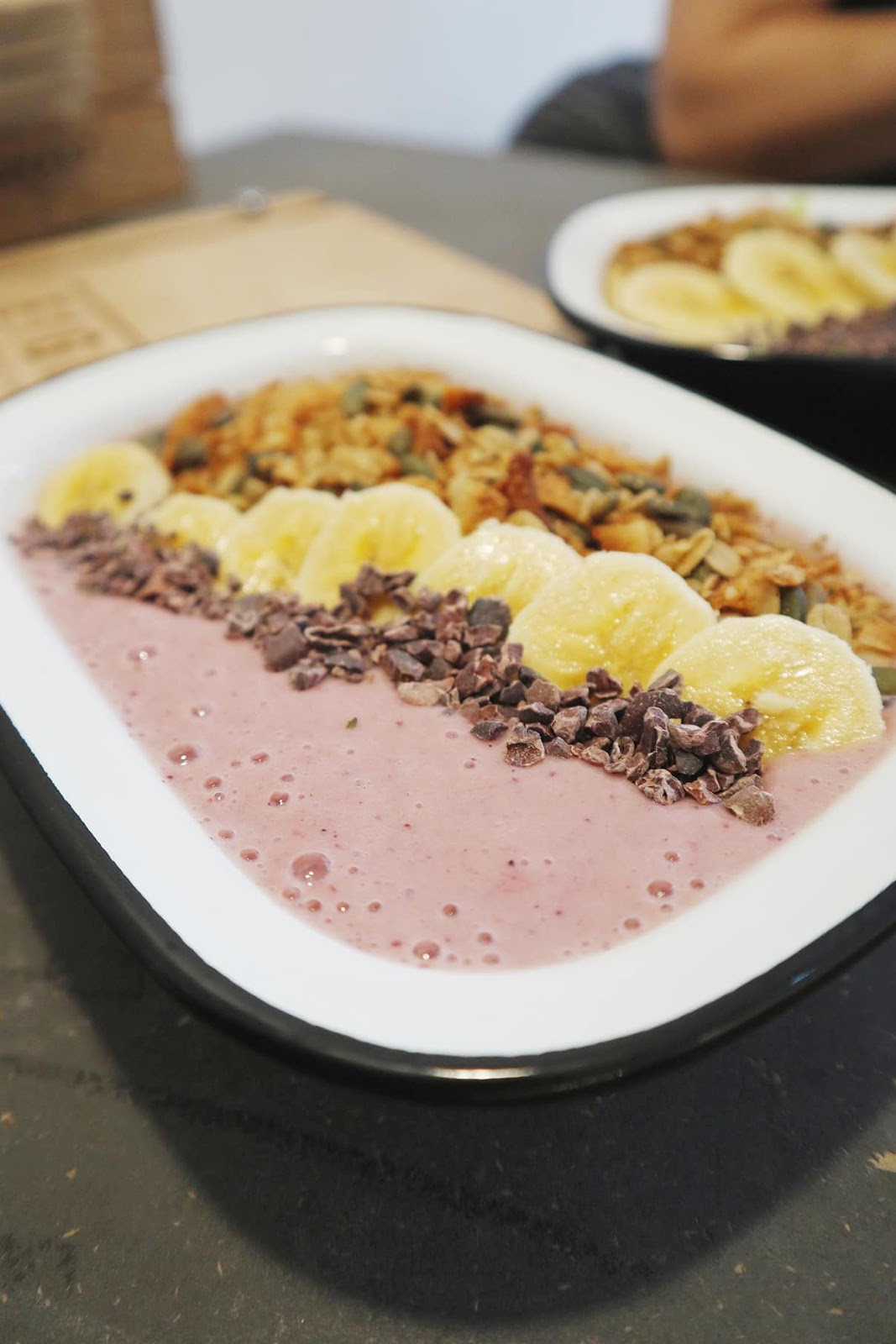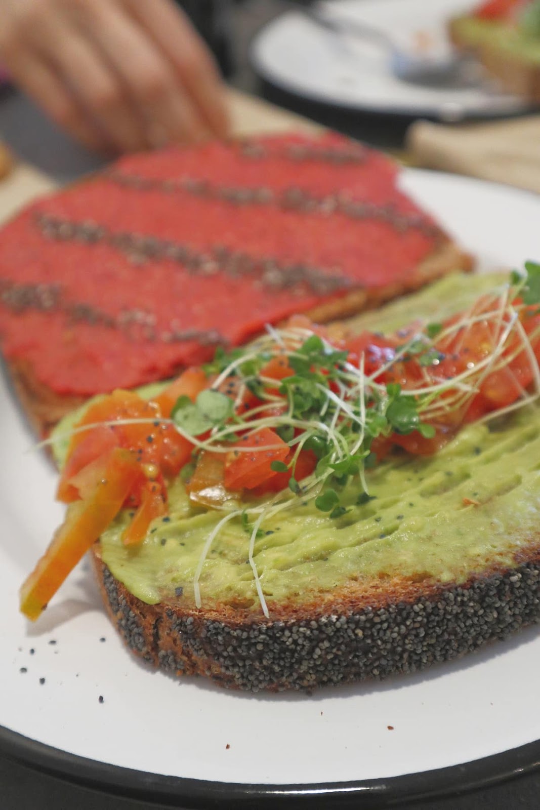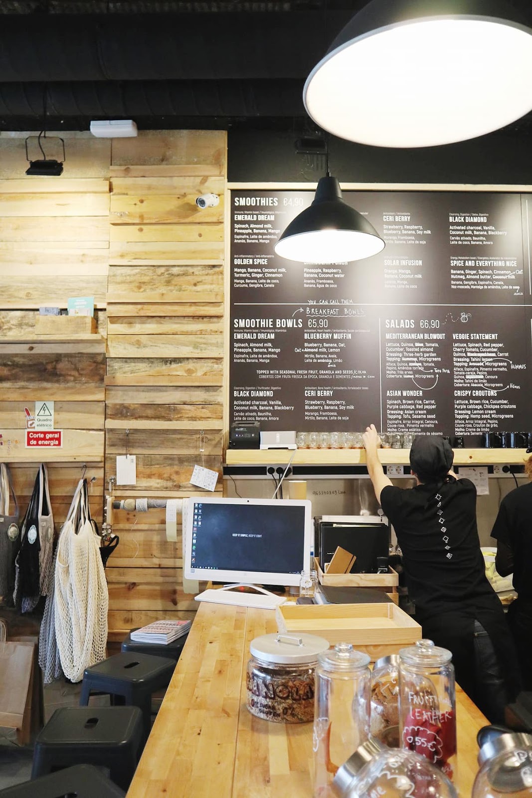 Há tostas de abacate, tostas com sementes de chia, manteiga de coco e geleia de morango e ananás, com hummus ou ainda com queijo de caju. Há paninis, sumos, smoothies em copo e os maravilhosos smoothies em taça, com muita fruta fresca da época, granola e sementes. Há saladas com rebentos de uma estufa própria. Atenção o pão parece assim, sem graça, mas é delicioso.