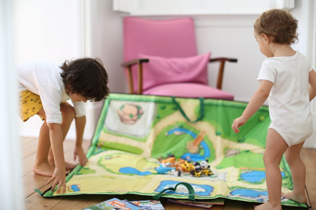 As vantagens? Os livros têm textos simples e fáceis de ler e estão cheios de ilustrações, com várias curiosidades: como é o animal, onde vive, o que come. Eles aprendem… e no fundo nós também! E estão a ver o tapete na fotografia? É uma caixa, na verdade! A caixa, que serve para guardar os animais, abre e transforma-se num tapete mágico para se brincar. Não voa, mas transporta-os, sem dúvida.